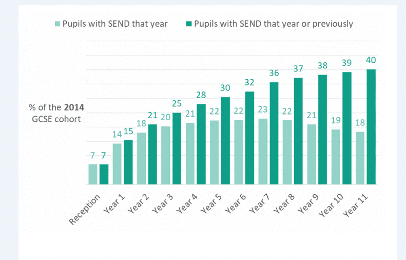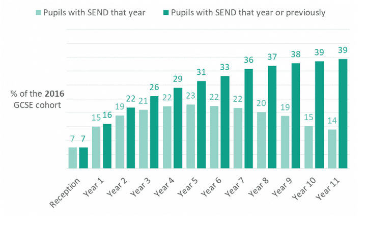 There is a striking difference between the percentage of children who have SEND in a given year group (at one point in time) and the percentage of children who have ever had SEND in that year group or previously. While a maximum of 23 percent of children in the 2016 cohort had SEND at any one time (the peak was in Year 5 when they were aged ten), a full 39 percent were recorded with SEND at some point between Reception (age five) and Year 11 (age sixteen). This makes SEND directly relevant to four in ten children, or twelve per class of thirty on average.